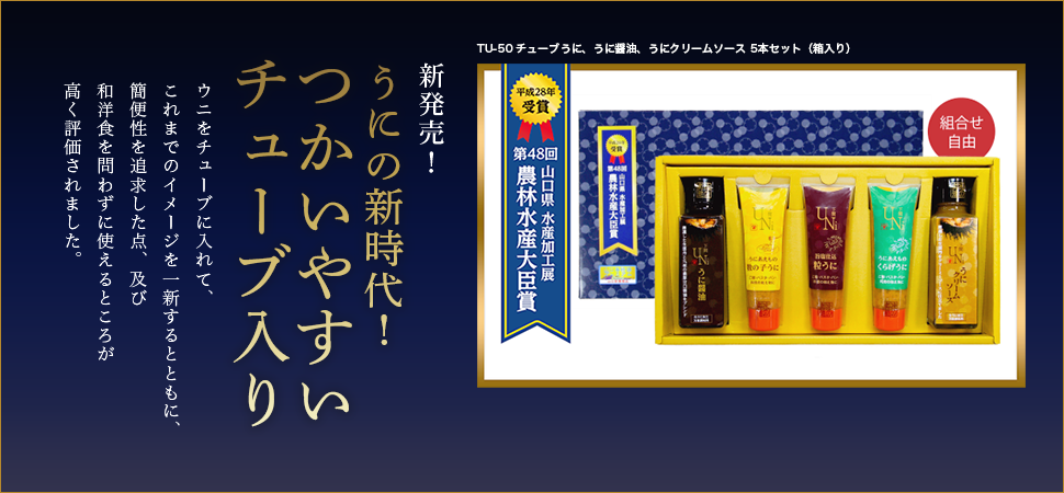 旨塩仕込粒うに、うにあえもの数の子うに、うにあえものくらげうに 各60g 箱入り 2,600円(税別)